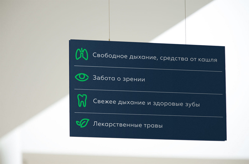 Агентство провело редизайн логотипа сети аптек, сайта, других корпоративных элементов и носителей (визитки, скидочные карты, пакеты и др.). В рамках проекта была также спроектирована система внутренней навигации. Графичные пиктограммы-указатели упрощают ориентирование покупателей внутри аптеки, помогают разделить товарные группы и отделы каждого из пунктов сети.