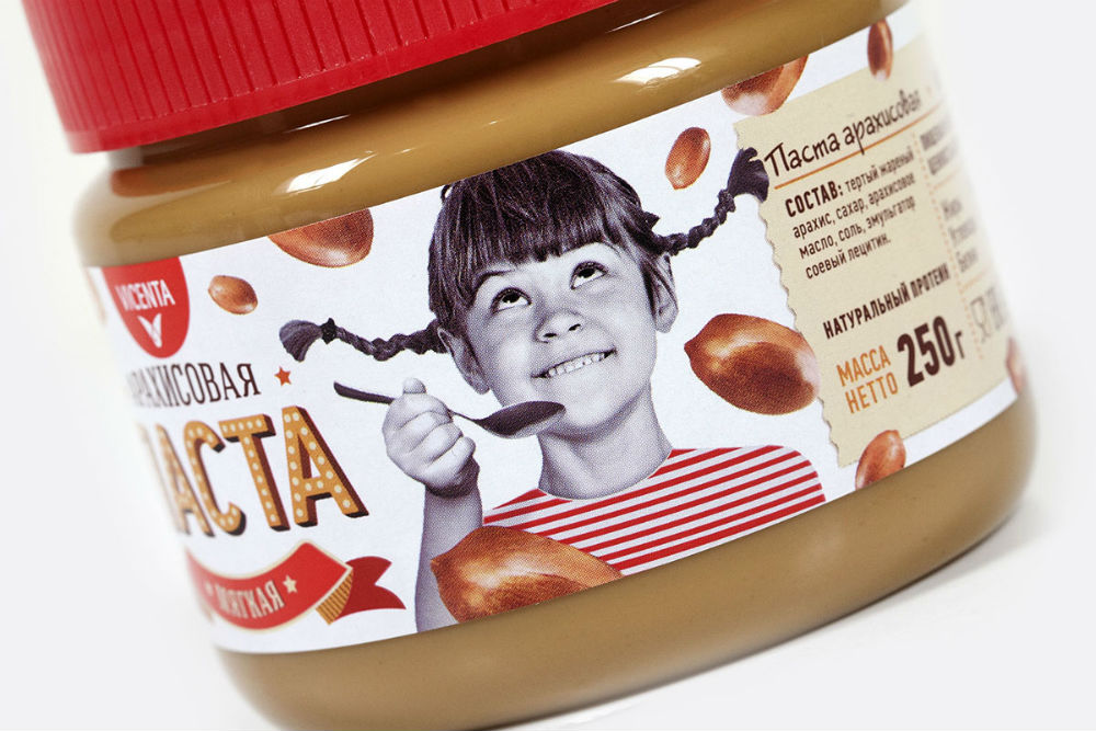 «Паста решена в стилистике идеальной американской семьи: счастливые дети всех национальностей, которые только и ждут, когда вы откроете банку и накормите их сладким десертом. Шрифтовая композиция напоминает нам весёлое американское шапито с лампочками, лентами и звёздами», - сообщили в агентстве.