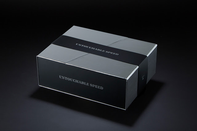 Крышку с коробки снимать не нужно. Она сделана в виде створок, разрезанных под углом и оснащенных магнитами. Дополнительную сохранность содержимому обеспечивает опоясывающая коробку лента, а также прозрачная акриловая панель внутри, на которой напечатано приглашение. Блеск кроссовок усиливается за счет серебряной фольги внутри коробки.