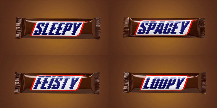 Кондитерский бренд Snickers запрыгивает на ходу в набирающий скорость поезд под названием «персонализированная упаковка». Воодушевившись именными бутылками Coca-Cola, шоколадные батончики Snickers меняют свое название на симптомы голода. Вооружившись слоганом бренда Mars «Ты – не ты, когда ты голоден», Snickers призывает покупателей делиться шоколадными батончиками с голодными друзьями или родственниками.