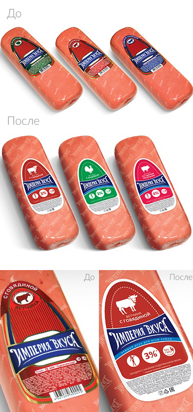 Видел Империю Вкуса на полках. Но, честно говоря, если бы не прочитал про премиальность, то и не узнал. Всё-таки лучше учитывать стереотипы восприятия премиальных продуктов и не делать "залипухи" из качественного продукта. Напоминает продукт райцентрового чудом выжившего в 90-е мясокомбината.