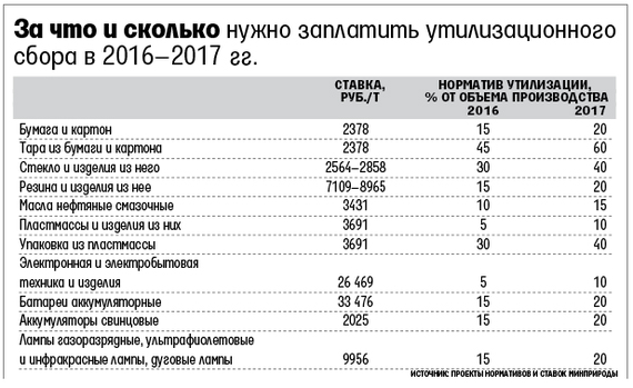 Поправки в закон об отходах, обязавшие производителей и импортеров утилизировать выпущенные и ввезенные товары, приняты в конце 2014 г. В конце сентября 2015 г. правительство утвердило 36 категорий товаров, за которые придется платить сбор (см. таблицу), а Минприроды – разослало проект постановления правительства с размерами сбора за утилизацию: от 2378 руб. за тонну бумаги, картона или газет до 33 476 руб. за тонну свинцовых аккумуляторов. Это сопоставимо с экологическими платежами для производителей в Евросоюзе, объяснял министр природы Сергей Донской.