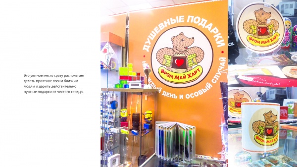 Мы оформили логотип в теплом оранжевом цвете, чтобы магазин «Фром май харт» можно было легко заметить и ни в коем случае не пройти мимо. Кроме того, такое решение добавляет персонажу душевности и создает отличный цветовой микроклимат на торговой точке. Это уютное место сразу располагает делать приятное своим близким людям и дарить действительно нужные подарки от чистого сердца", - рассказали в агентстве.