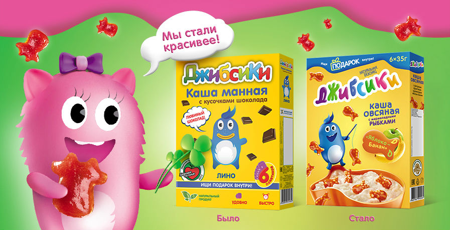 «Джибсики» - это на 100% натуральные каши со звездочками или рыбками из фруктово-ягодного мармелада, которые производитель называет «дробсиками». Дробсики сделаны из настоящих фруктовых соков с очень ярким сладко-кислым вкусом. Это абсолютно новый ингредиент на российском рынке, ещё никто не применял эти фигурки ни в одном из продуктов.