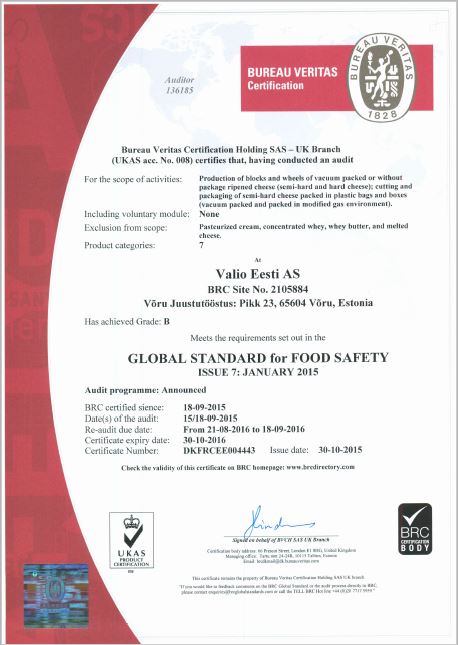 Выруский сырный завод Valio Eesti успешно прошел аудит престижного международного центра сертификации Bureau Veritas Certification и был удостоен сертификата пищевой безопасности, который значительно упрощает продажу продукции на экспортных рынках.