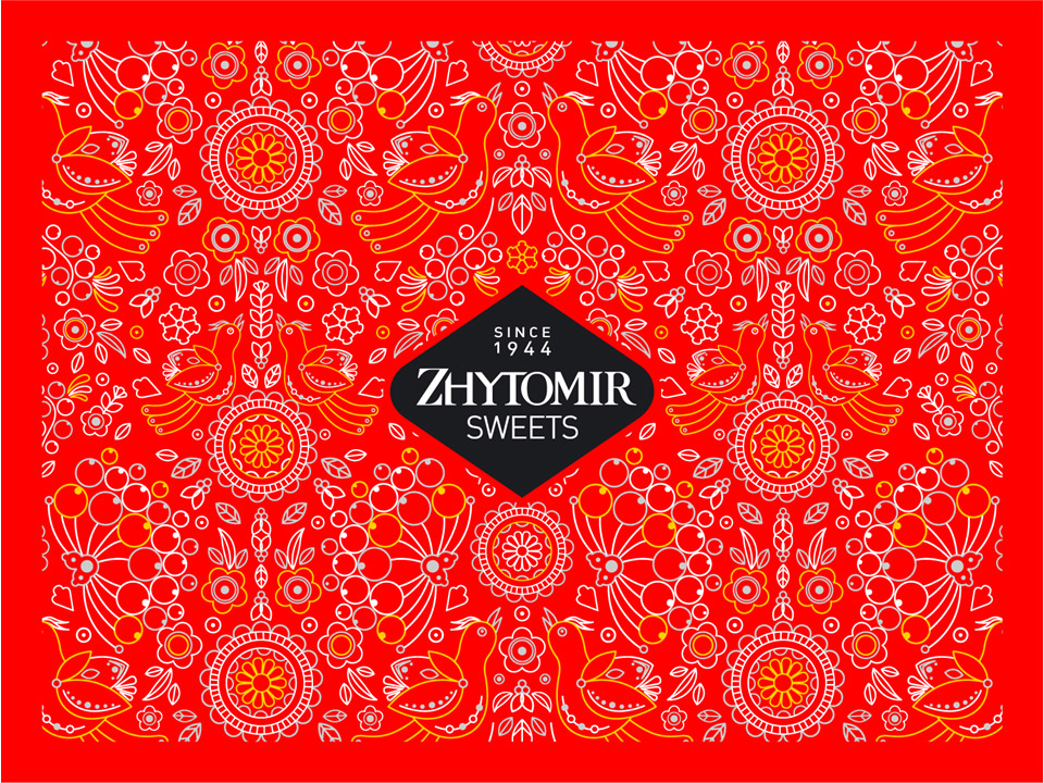 Что же изменилось? Во-первых, новый бренд получил имя «Zhytomir Sweets» и логотип в виде ромба с округленными «боками». Внутри логотипа значится название бренда и год основания предприятия. Во-вторых, новый фирменный стиль приобрел такой элемент, как паттерн – узор с повторяющимися элементами, специально разработанный художниками для бренда «Zhytomir Sweets».