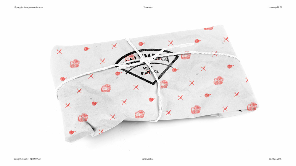 Также разработаны специальные графические образы, «рассказывающие» о различных типах мяса, которое подается в бутике: говядина, телятина, баранина и птица. Каждое изображение дополняется характерной схемой разделки туши. При упаковке продавец помечает ту часть туши, из которой бралась вырезка.