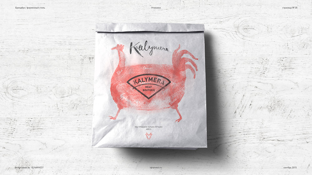Фирменный знак удачно отражает статус бренда Kalymera. Очертания знака похожи одновременно на штамп (клеймо) для животных и на упаковочный пакет для мяса - именно в такую форму предполагается заворачивать вырезки для клиентов. Основной цвет бренда – красный. Он хорошо отражает продуктовую часть бренда и в тоже время не несет агрессивной составляющей.