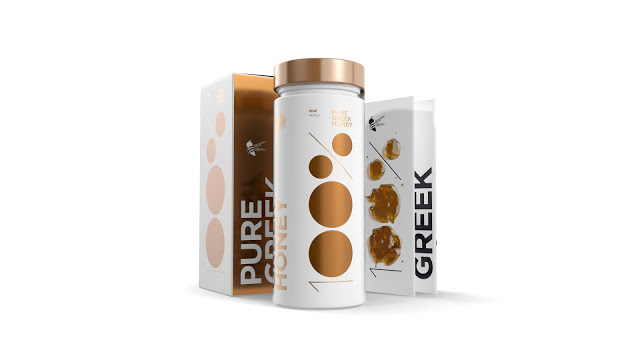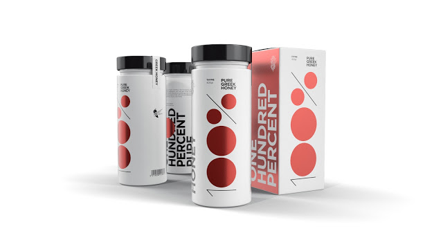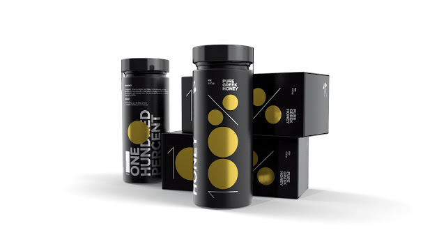 В основу айдентики легли простые цветовые сочетания: лаконичные черный, белый и третий цвет, контрастирующий и дифференцирующий. Айдентика базируется на идее «100% чистый греческий мед». Кстати, название бренда так и звучит - One Hundred Percent (пер.: сто процентов). Логотипом стала очаровательная пчелка.