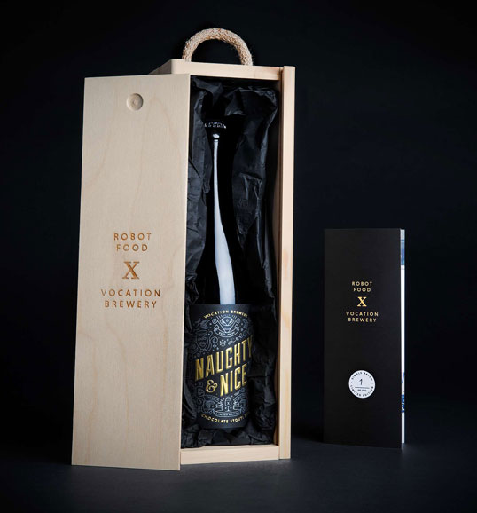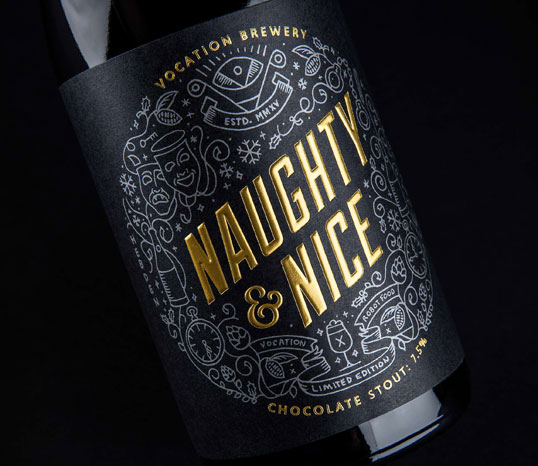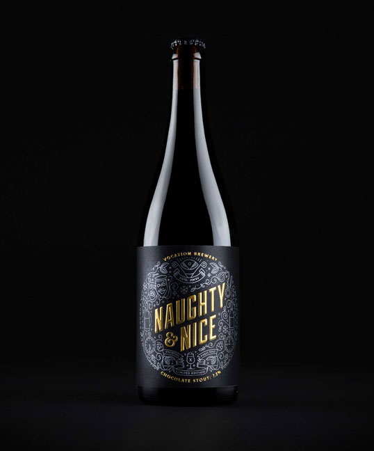 Очередная совместная работа британской пивоварни Vocation и студии дизайна Robot Food привела к появлению праздничной серии крафтового шоколадного стаута Naughty & Nice. Пиво вышло ограниченной серией в 1323 бутылки по 750 мл.