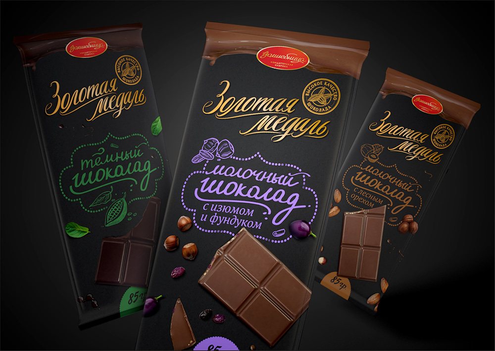 В брендинговое агентство «Гордость» обратилась московская кондитерская фабрика «Волшебница» за разработкой концепции дизайна упаковки для плиточного шоколада серии «Золотая медаль». Речь идет о молочном и темном шоколаде, а также молочном шоколаде с добавками в средней ценовой категории.