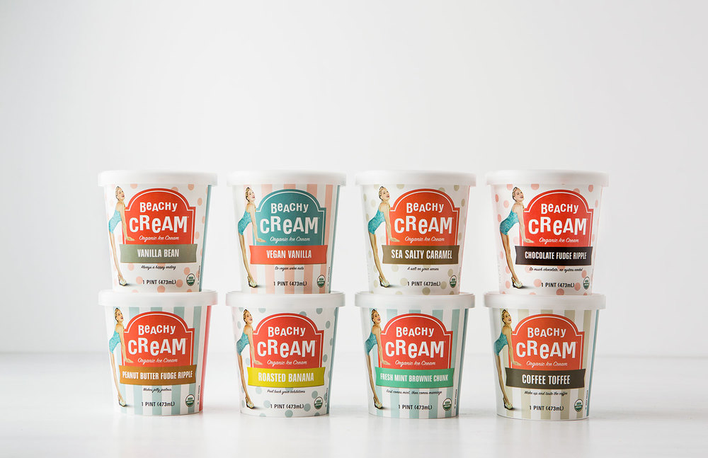 Американская студия Design Womb организовала тур в 50-ые, представив дизайн упаковки для мороженого Beachy Cream Organic Ice Cream. Это органическое мороженое, которое продается по всей Калифорнии, поэтому не удивительно, что производитель выбрал тему лета и беззаботных каникул.
