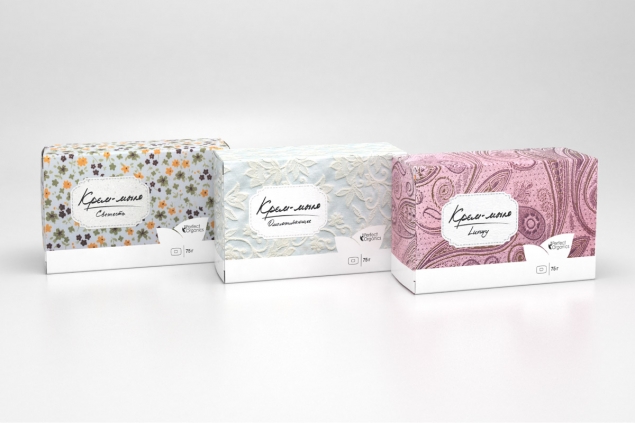 В контексте рисунок и фактура ткани демонстрируют ощущения, свойства и ценовой сегмент. Например, мелкотравчатый ситец отражает цветочно-травяной состав мыла и отвечает за увлажнение кожи. Атлас с вышивкой позиционируется в сегменте lux и отвечает за омоложение.