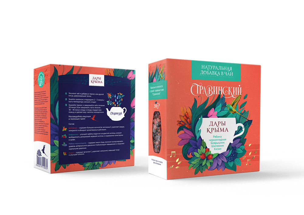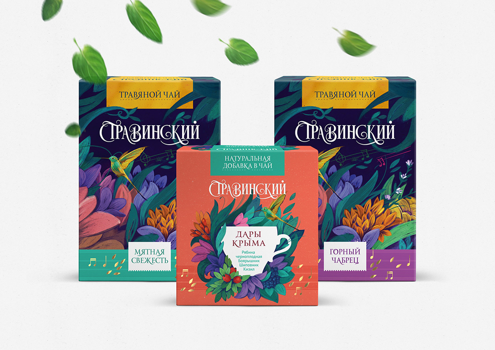 В процессе работы над проектом дизайнеры отказались от идеи делать минималистичный, сдержанный дизайн. Поскольку подобным образом в основном выглядят аптечные травяные чаи, а бренду было важно отстроится от них. Создатели хотели подчеркнуть, что чай "Стравинский" в первую очередь подарит потребителю удовольствие и наслаждение вкусом, поможет погрузиться в сказочный мир флоры. Собственно чая в составе нет вообще, он на 100% состоит из трав. А для того, чтобы рассказать о его пользе, дизайнеры использовали заднюю сторону упаковки. На лицевой же стороне раскинулся волшебный, фантастический мир растений.