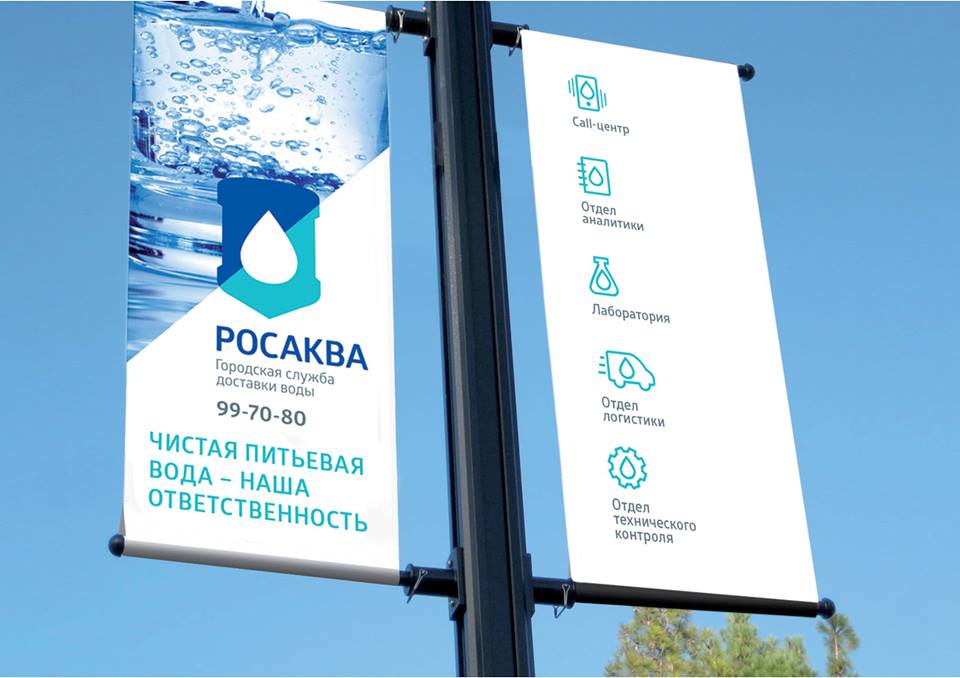Студия Pavlov's design (Рязань) разработала бренд городской службы по доставке воды Росаква. Идея бренда - Ведомство по доставке питьевой воды людям.