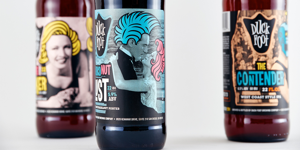 Duck Foot – самое подходящее пиво для вечеринок. Его веселая, оригинальная эстетика хорошо отражена яркими цветами и винтажными фотографиями, оформленными коллажем с графическими элементами.