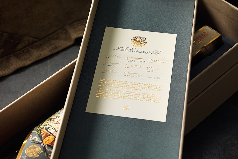 Этикетки на бутылку и коробку наклеены и пронумерованы вручную. Для того чтобы открыть коробку, покупателю придется разорвать красивую этикетку, потянув за веревку. Это ассоциируется с особым ритуалом начала праздника. В наборе также есть медная монета, отчеканенная специально для Grönstedts 'Le National'.