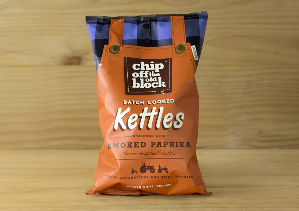Компания Chip Off The Old Block выращивает картофель и производит чипсы в третьем поколении, что нашло отражение в слогане и оригинальной иллюстрации на упаковке. Стиль, язык, название бренда, спокойная цветовая гамма, рубаха, кармашек на рабочем комбинезоне и ярлычок "Сделано в Новой Зеландии" – все это призвано подчеркивать УТП бренда о трех поколениях, а так же контрастно выделять продукт среди ярко раскрашенных конкурентов.