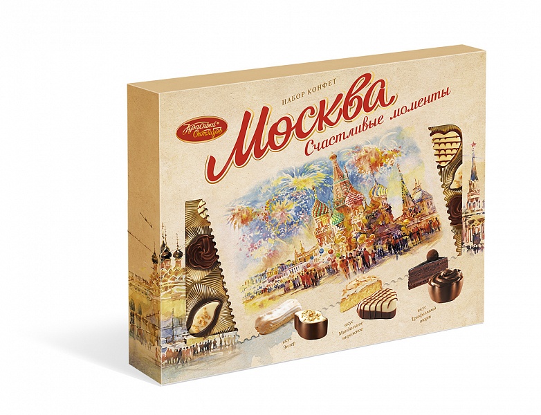 Идея использования вкусов популярных десертов открыла перед производителями кондитерских изделий новые возможности и позволила значительно разнообразить ассортимент, чтобы удовлетворить самых взыскательных потребителей. Для набора «Москва. Счастливые моменты» были выбраны вкусы именно тех десертов, которые знакомы и любимы всеми поколениями россиян.