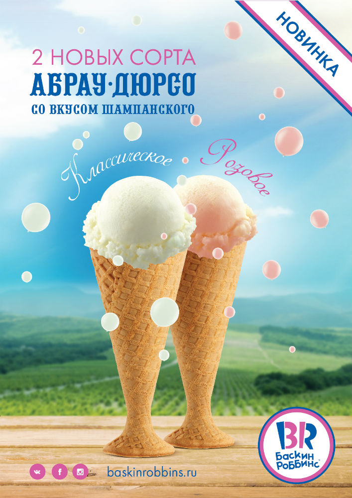 Сорбеты (французское «сорбе» от арабского «шербет») пользуются растущей популярностью у потребителей, так как содержат меньше калорий и сахара, чем традиционное мороженое, и позволяют создавать изысканные вкусовые комбинации на основе натуральных фруктов и ягод. В ресторанной кухне спиртные напитки часто добавляют в блюда для придания им яркого вкуса. В новых сорбетах «Баскин Роббинс» тонкий вкус знаменитого шампанского «Абрау-Дюрсо» гармонирует с фруктовой основой.