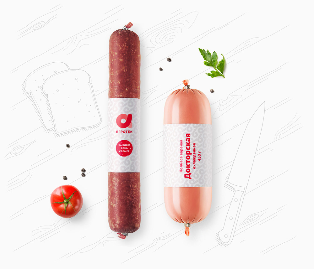 Камчатская компания «Агротек» производит колбасы, сосиски, полуфабрикаты и замороженные готовые блюда. В студии Артемия Лебедева для разнообразной продукции компании созданы макеты заметной и запоминающейся упаковки.
