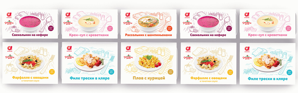 В серии «Домашнее меню» выпускаются пельмени и вареники, супы и вторые блюда. Упаковка подчеркивает знакомый вкус и натуральность продукции. Тип и цвет контурной графики зависит от состава блюда — мясное, рыбное или вегетарианское.