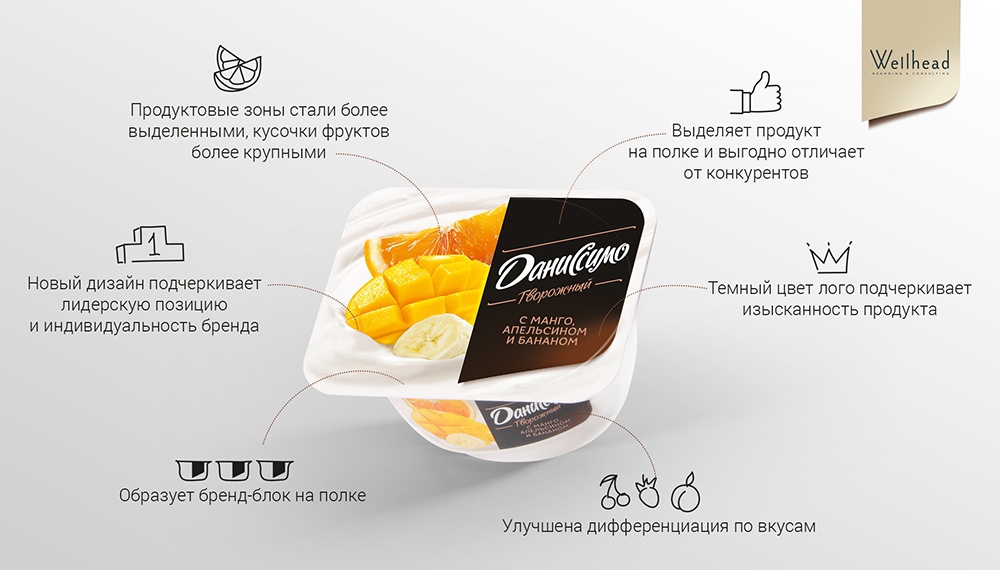 «Даниссимо» уже много лет является лидером на рынке творожных десертов, что достигается за счет множества факторов, среди которых можно выделить опережение трендов и соответствие предпочтениям потребителей. Проект по разработке нового дизайна являлся многозадачным, было необходимо: добиться более изысканного и аппетитного изображения продуктовых групп; дифференцировать вкусы; создать заметный бренд-блок.