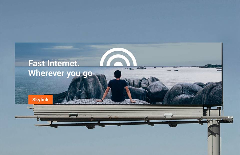 Skylink — это новый формат интернета. Сеть работает на частоте 450МГц, что значительно расширяет зону покрытия базовой станции, мощность и качество сигнала. В основу айдентики дизайнеры заложили главное преимущество продукта — возможность использования интернета Skylink в отдаленных, труднодоступных уголках России.