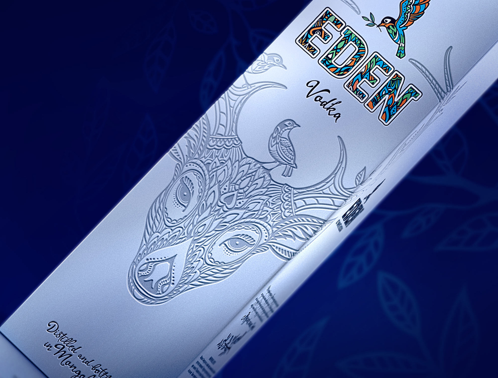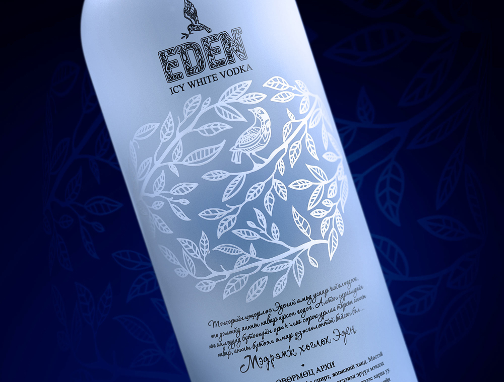 Особенностями дизайна стали тщательно прорисованный орнамент, локальные цветовые акценты, авторская каллиграфия, тиснение на подарочной упаковке. Объемный эффект, создаваемый листвой на задней стороне бутылки, сочетание матового и прозрачного стекла создают целостный и проработанный образ бренда новой премиальной водки EDEN.