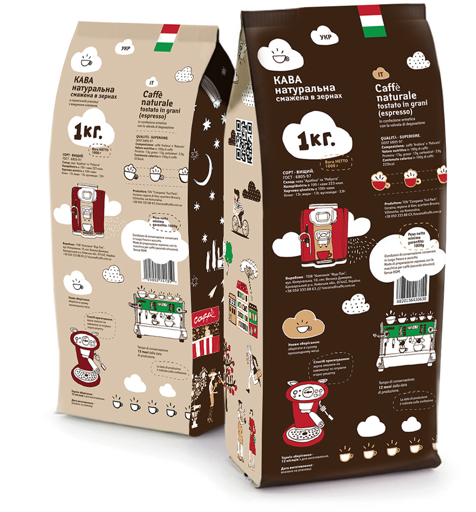 Разные сорта кофе дизайнер сравнила с днем и ночью в Италии. Легкий отвечает за дневное время, более насыщенный — за ночное. Вся упаковка покрыта забавными иллюстрациями, которые хочется рассмотреть поближе. Скучная информация на задней стороне упаковки также представлена в виде картинок. А это гораздо больше шансов, что покупатель прочтет ее.
