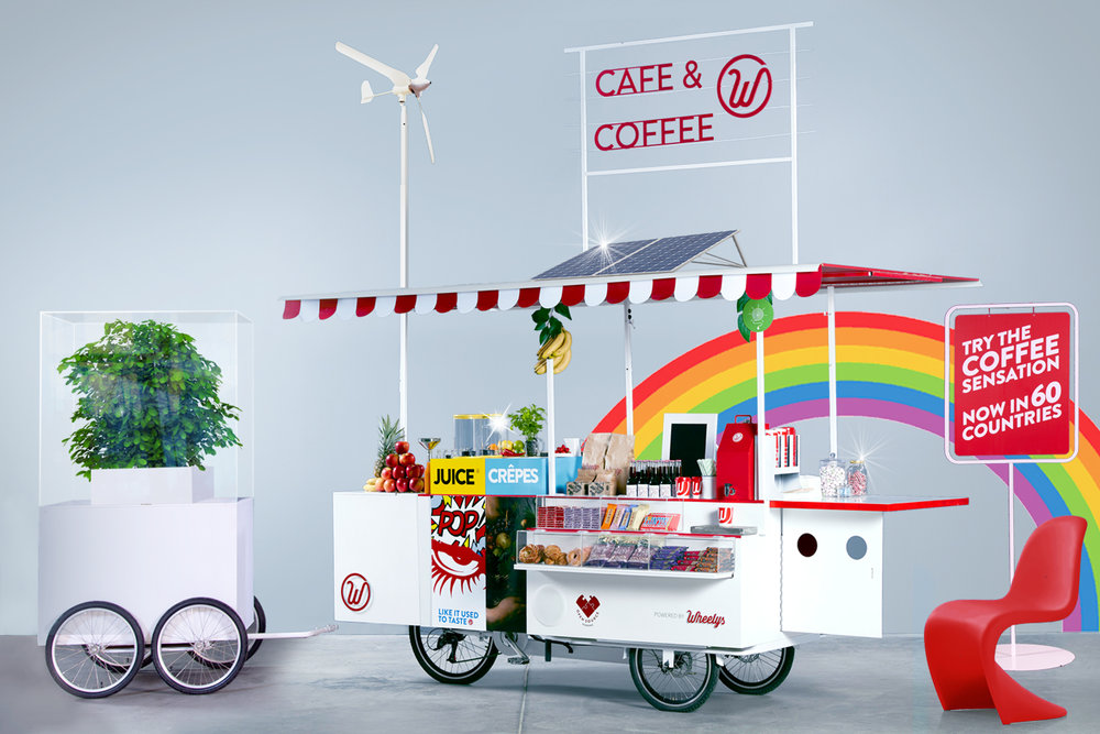Проект Wheelys Café создан в 2014 году как стартап. За один день он собрал нужную сумму денег. Сейчас экологичные кафе на велосипедных колесах можно увидеть во 65 странах мира. Это самая быстро растущая сеть фаст-фуд в мире. Мобильные кафе оснащены солнечными панелями, которые полностью обеспечивают работу ЖК экрана, динамиков, раковины, Wi-Fi роутера и тд.