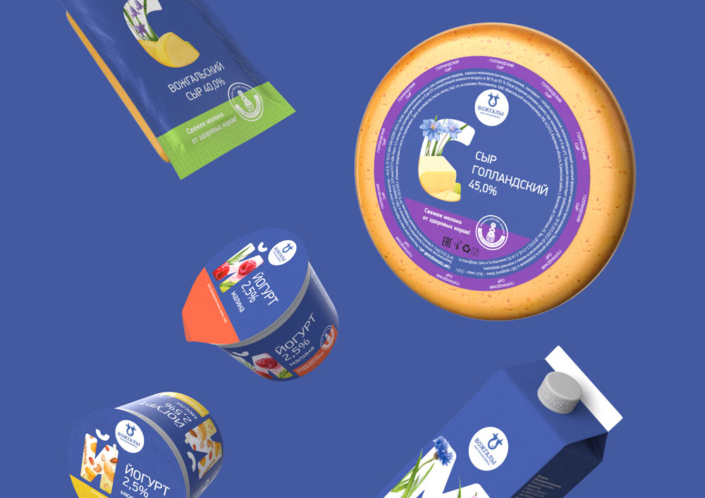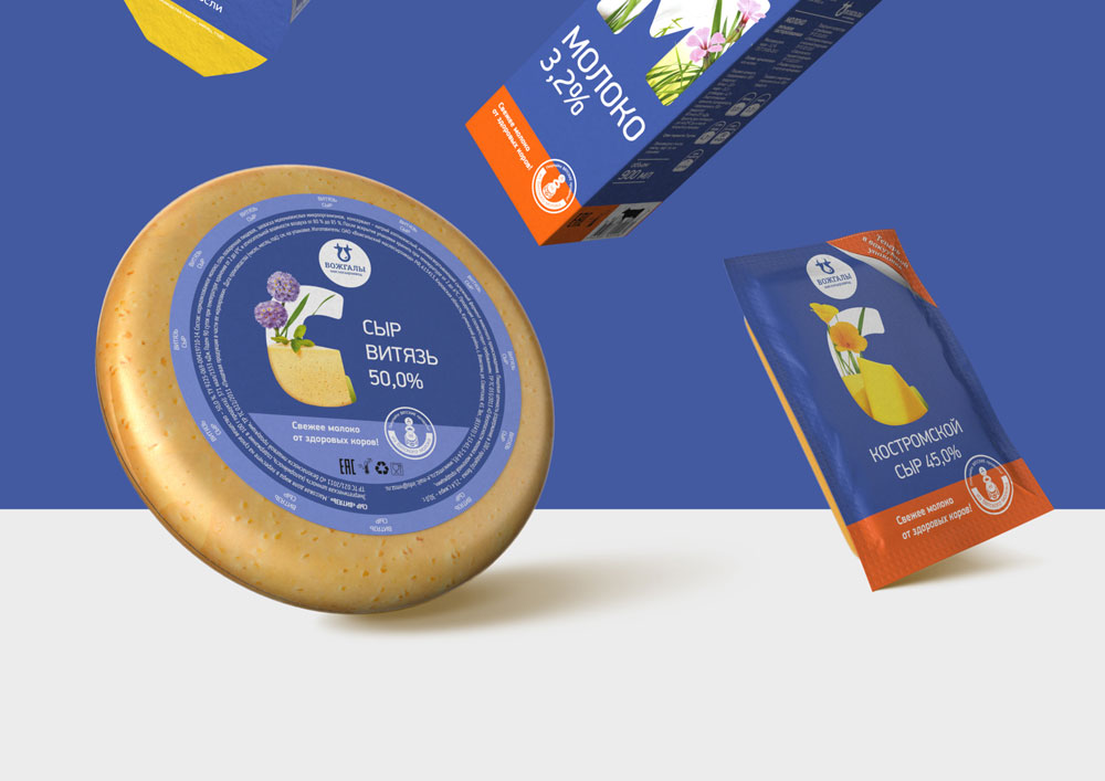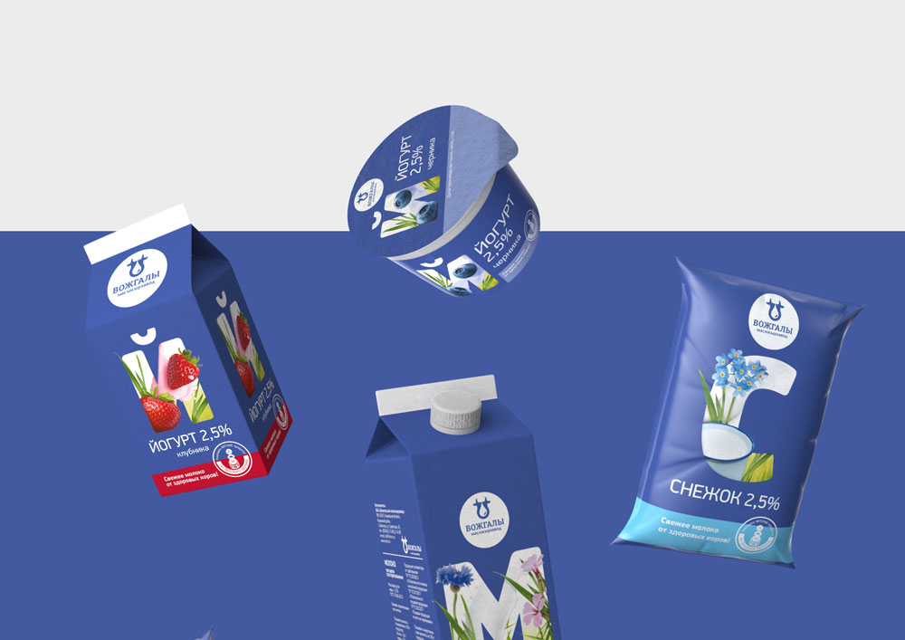 В качестве основного цвета для упаковки всей линейки Вожгальского маслосырзавода, в которую входят порядка 40 наименований, был выбран приятный глазу васильковый оттенок. Дополнительный дифференциатор — полоска контрастного цвета, которая служит обозначением жирности или вкуса.