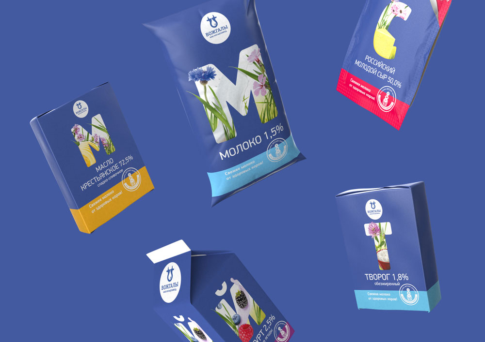 Крупная буква в центре упаковки позволяет мгновенно понять, что за продукт попал в руки покупателю (М — молоко, С — сметана, Т — творог и так далее). В букву для наглядности помещено изображение самого продукта, входящих в него ингредиентов и ярких полевых цветов, которые задают позитивные ассоциации с натуральностью происхождения молока и поддерживают лояльность потребителя.