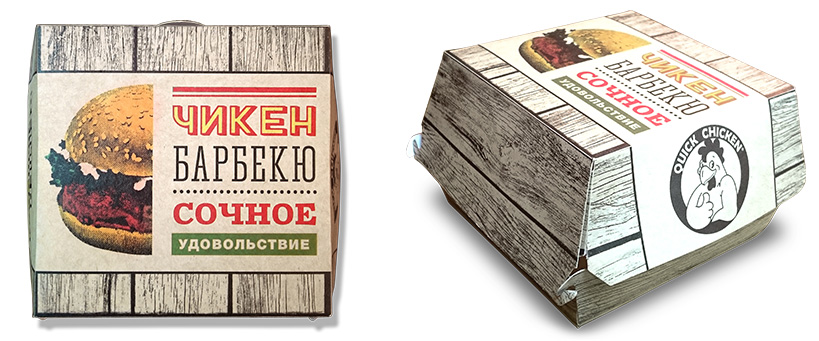 Верхняя часть крышки украшена принтом, состоящим из части изображения бургера и его названия с подкрепляющим слоганом, выполненным в стиле плакатной графики. Изображение самого бургера призвано указывать на содержимое. А каждое слово текста специально оформлено разными цветошрифтовыми решениями. Это сделано для того, чтобы подчеркнуть связь слова с предметом, который оно описывает и самим бургером. Таким образом, слово: «ЧИКЕН», набранное шрифтом желтого цвета с красной окантовкой, символизирует жаренное куриное мясо с корочкой; «БАРБЕКЮ» с тонким шрифтом черного цвета напоминает об углях; «СОЧНОЕ» жирным шрифтом красного цвета обозначает томаты или кетчуп; «УДОВОЛЬСТВИЕ», напечатанное поверх зеленой плашки, вызывает образ свежей зелени.