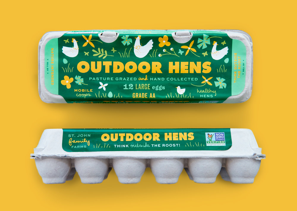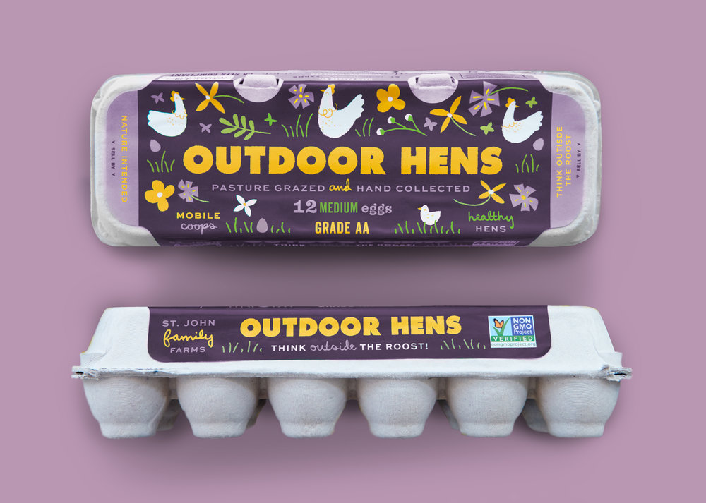 В компании St. John Family Farms знают, что лучшие яйца получаются от кур, выращенных в натуральных условиях. Поэтому их куры пасутся на свободном выгуле весь день. Дизайнеры американского агентства Olio Studio сделали это основной темой при разработке новой упаковки.