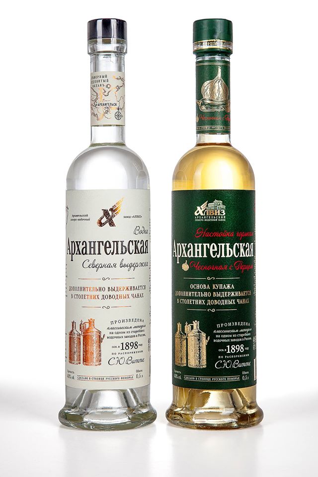 В целом оформление бутылки наследует дизайну «Архангельской Северная Выдержка»: медное тиснение на плотной винной бумаге, изображение старинных доводных чанов, сложная шрифтовая композиция, которая подталкивает потребителя «изучить» этикетку. Из ярких отличий – благородный зеленый цвет этикетки и иллюстрация с изображением чеснока и перца в стиле гравюры на широкой горловой этикетке.
