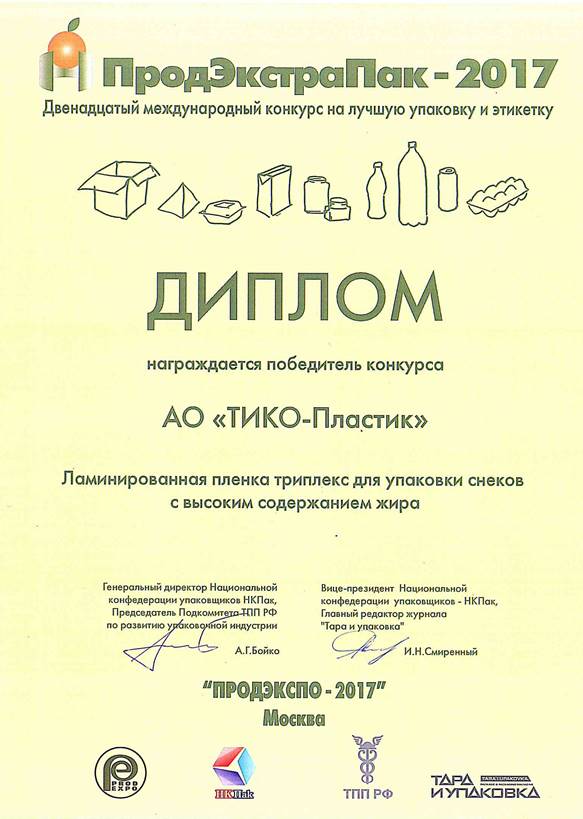 АО «ТИКО-Пластик» стало победителем в номинации «Упаковка для продовольственных товаров и напитков». Высокую награду предприятие получило за ламинированную пленку триплекс для упаковки снеков с высоким содержанием жира.