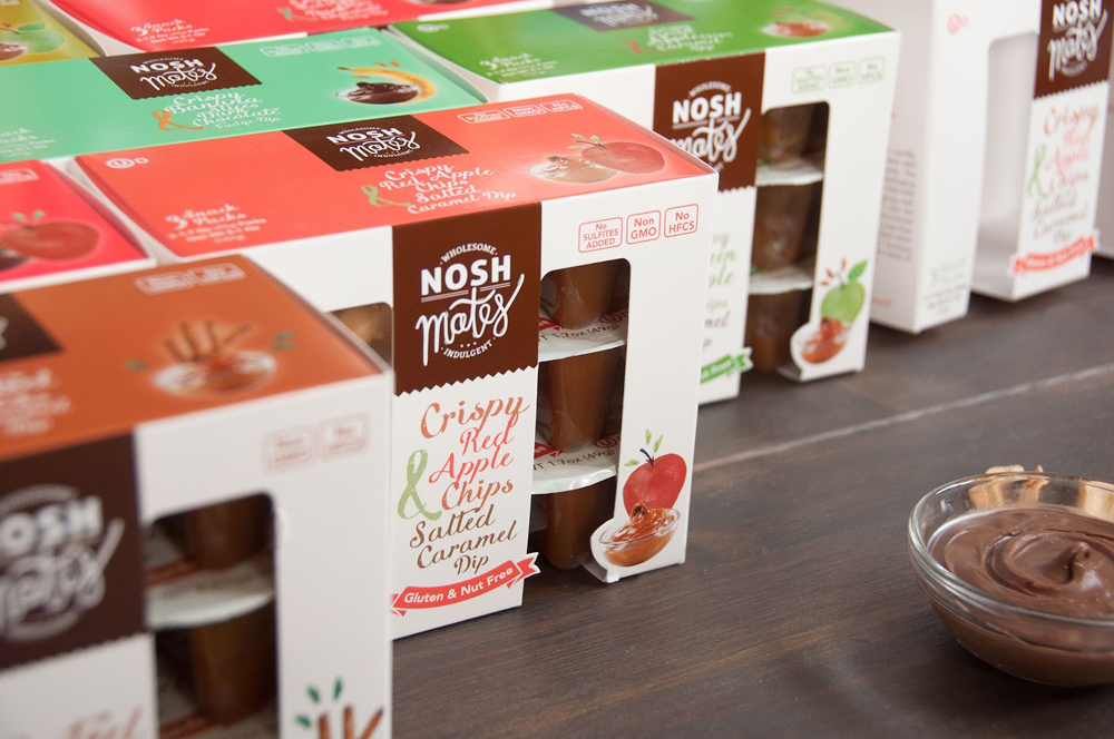 Nosh Mates - это чипсы из яблок, бананов или соленая соломка в наборе со сладким соусом из карамели или шоколада. Продукт позиционируется как легкий перекус.