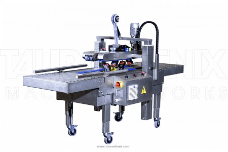 Полуавтоматический мультиформатный одновременно заклеивает верхний и нижний клапаны короба клейкой лентой, автоматически подстраивается под размер короба и работает в непрерывном режиме.