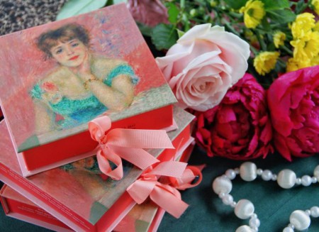 Для обложки коробки был выбран «Портрет актрисы Жанны Самари» Пьера Огюста Ренуара. На протяжении многих лет этот шедевр остается одним из самых любимых для посетителей Пушкинского музея. Женские образы занимали особое место в творчестве Ренуара, став для него воплощением душевной ясности, чистоты и безмятежности бытия. Одной из самых любимых моделей художника в 1870-е годы становится молодая актриса театра «Комеди Франсез» Жанна Самари. Она дебютировала в 1875 году в роли Дорины в пьесе Мольера «Тартюф». До своего замужества Самари жила недалеко от мастерской Ренуара на улице Фрошо и часто позировала художнику. В 1877 году Ренуар создал один из самых прекрасных ее портретов. Одновременно улыбающаяся и задумчивая, в изысканном зелено-голубом платье, актриса предстает перед зрителем на воздушном розовом фоне. В облике своей модели художник подчеркивает ее лучшие черты: мягкую грацию, живой ум, немного лукавый взгляд синих глаз и лучезарную улыбку, «освещающую все вокруг».