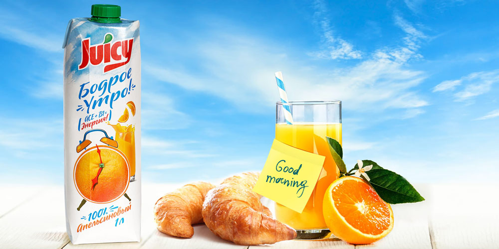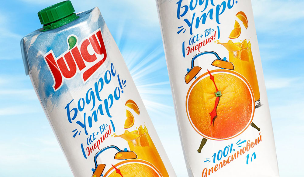 Апельсиновый сок считается источником энергии и именно поэтому он является непременным атрибутом европейского завтрака. Суббренд Juicy "Бодрое утро" сосредоточен на коммуникации дополнительных, «утренних» свойств продукта — пользы, витаминов, заряда бодрости. Результатом стал новый дизайн упаковки, ключевой элемент которого – изображение апельсина, стилизованного под форму будильника. Сочные и «вкусные» цвета на «утреннем» бело-голубом фоне смотрятся особенно свежо и контрастно. Яркие клеймы акцентируют внимание потребителя на полезности продукта.