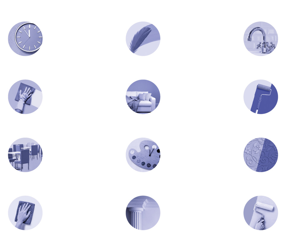 Федеральный масштаб распространения и широкая линейка интерьерных красок требовали структурированного решения для донесения преимуществ. Поэтому, заменив традиционные векторные пиктограммы фотореалистичными объектами, дизайнеры разработали систему иконок, раскрывающих свойства конкретного продукта. При этом сюжеты иконок, в зависимости от свойств материала, варьируются от метафорических до реалистичных. Также была разработана совокупность допустимых композиций и подобран единый угол наклона объектов.