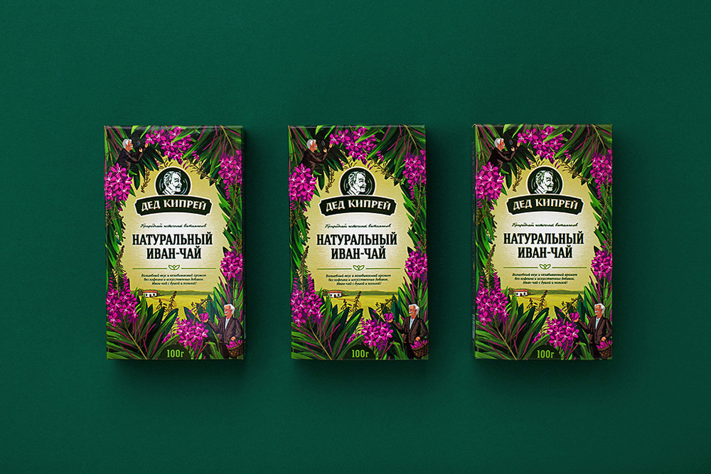 Дизайн-концепция, основанная на авторской иллюстрации с имитацией масляной живописи, развивает бренд-легенду, в которой дед Кипрей изучает растения иван-чая и собирает лучшие образцы. Упаковка рассказывает о целебности, богатой истории напитка, а также о тщательном подходе к отбору сырья производителем.