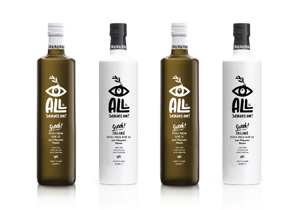 Разрабатывая дизайн упаковки для масла ‘All Senses On’, специалисты Sophia Georgopoulou взяли за основу сущность продукта. Оливковое масло всегда было и будет. Дизайнеры создали вневременной образ. Здесь нет фольклорных элементов «старой» Греции. В простом, но оригинальном логотипе сочетаются изображения глаза и птицы, держащей ветку оливы в клюве. Глаз символизирует внимание и заботу по отношению к производству.