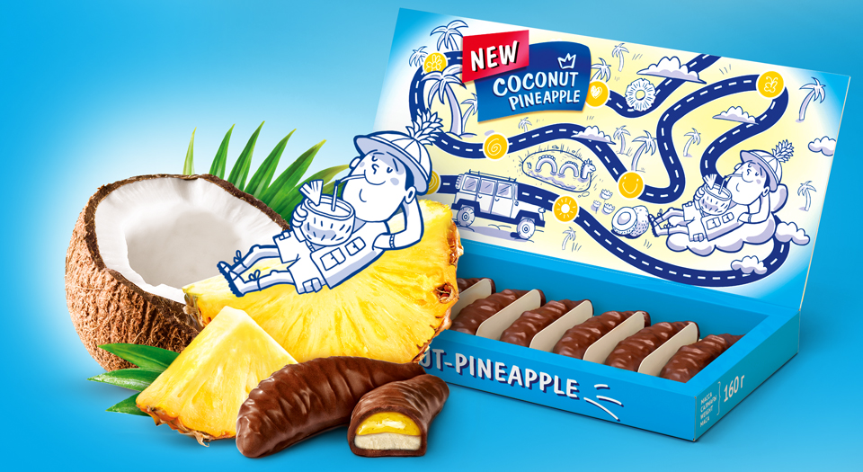 Новая упаковка получилась не просто яркой и интересной. Она на порядок улучшила коммуникацию вкуса и свойств продукта. Написание логотипа стало более динамичным, фуд-зона увеличена и содержит как изображение продукта, так и отрисованные визуализации вкусовых ингредиентов. Изменилась и сама конструкция картонной упаковки: в новом варианте появилась открывающаяся крышка. Также, по предложению агентства, в дизайн упаковки введен фирменный персонаж – путешественник, добывающий лучшие плоды для самого нежного фруктового суфле.