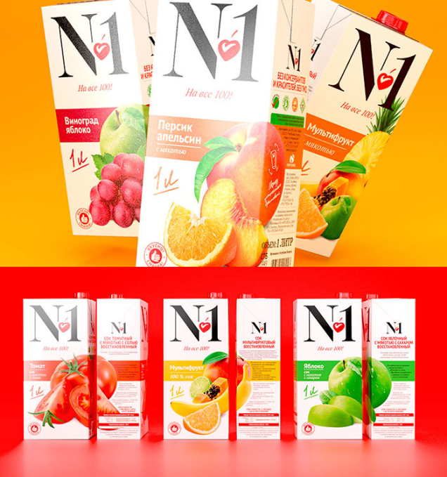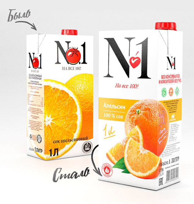 У "Сока №1" была свойственная данной категории упаковка: яркая и сочная фудзона на светлом, не отвлекающем внимания, фоне. Но некоторые элементы вызывали вопросы: наличие томата в логотипе даже на фруктовых соках, текстовый блок, перекрывающий фудзону.