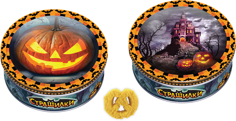 Специально для бренда «Страшилки» было разработано два уникальных дизайна жестяных банок — со светильником Джека и возвышающимся на пригорке таинственным замком Дракулы. Боковины обеих банок выполнены в едином стиле. На них изображено все, что традиционно ассоциируется с детскими страшилками — ведьмы, летучие мыши, светящиеся тыквы и полная луна.
