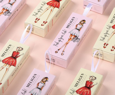 Визуальное решение упаковки нацелено на притяжение внимания современных девушек, заботящихся о себе и следящих за модными трендами. Сыворотка выпускается в виде удобных флакончиков розового серебра, упакованных в аккуратные мягко-розовые и нежно-персиковые коробочки с перламутровыми лентами. На каждой из упаковок располагается иллюстрации стильных девушек, которые выглядят безупречно даже без косметики благодаря своим натуральным, длинным и густым ресничками. Одного флакончика нового средства хватает на месяц использования, поэтому индивидуальные коробочки собираются в удобные и стильные групповые сеты на всю продолжительность курса.