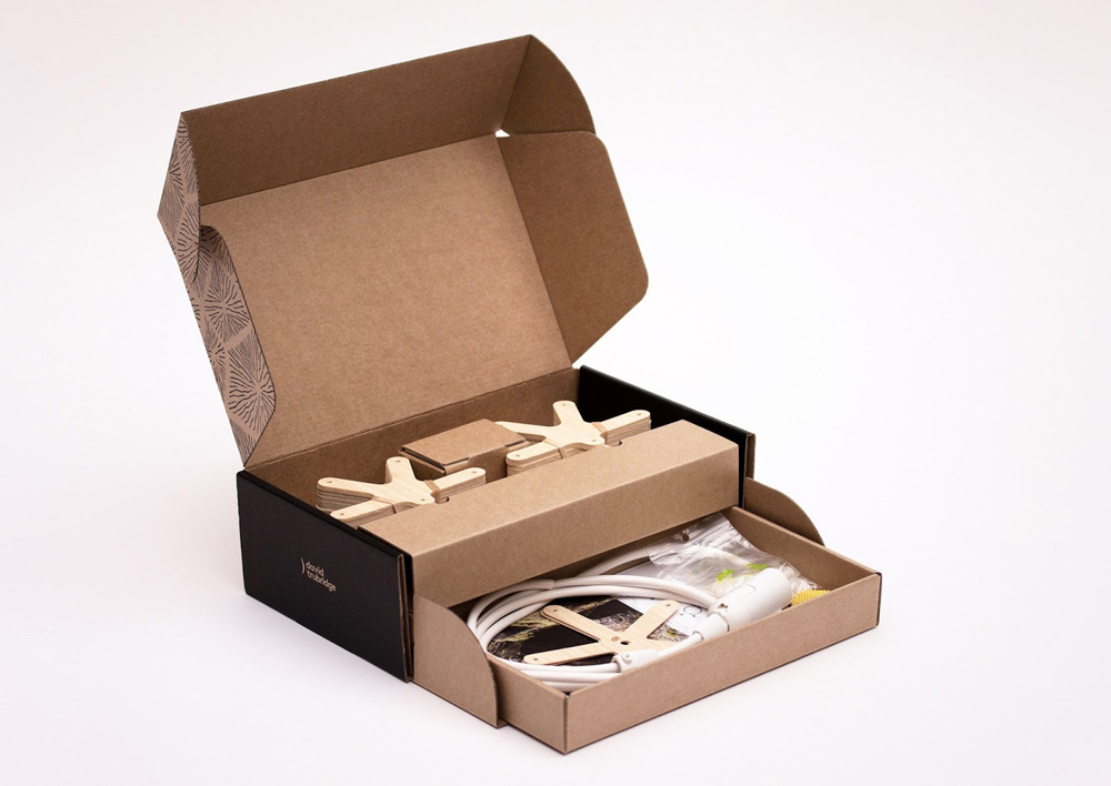 Так как дизайнерский светильники David Trubridge также продаются в США, нужно было доработать коробку, удобную для транспортировки и распаковки. Американские стандарты отличаются от новозеландских, и необходимо было оснастить светильник другими комплектующими. В результате предыдущая упаковка перестала вмещать все составные части.
