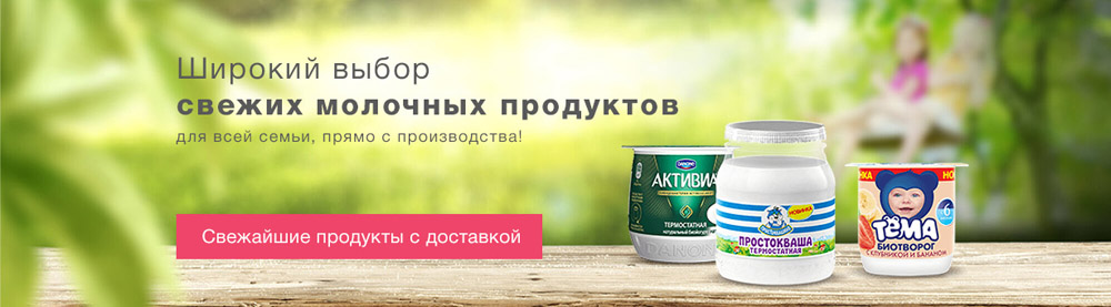 В интернет-магазине можно приобрести молочные продукты и продукты детского питания под брендами «Тема», «Простоквашино», «Активиа» и Actimel. Минимальная сумма заказа — 500 руб.